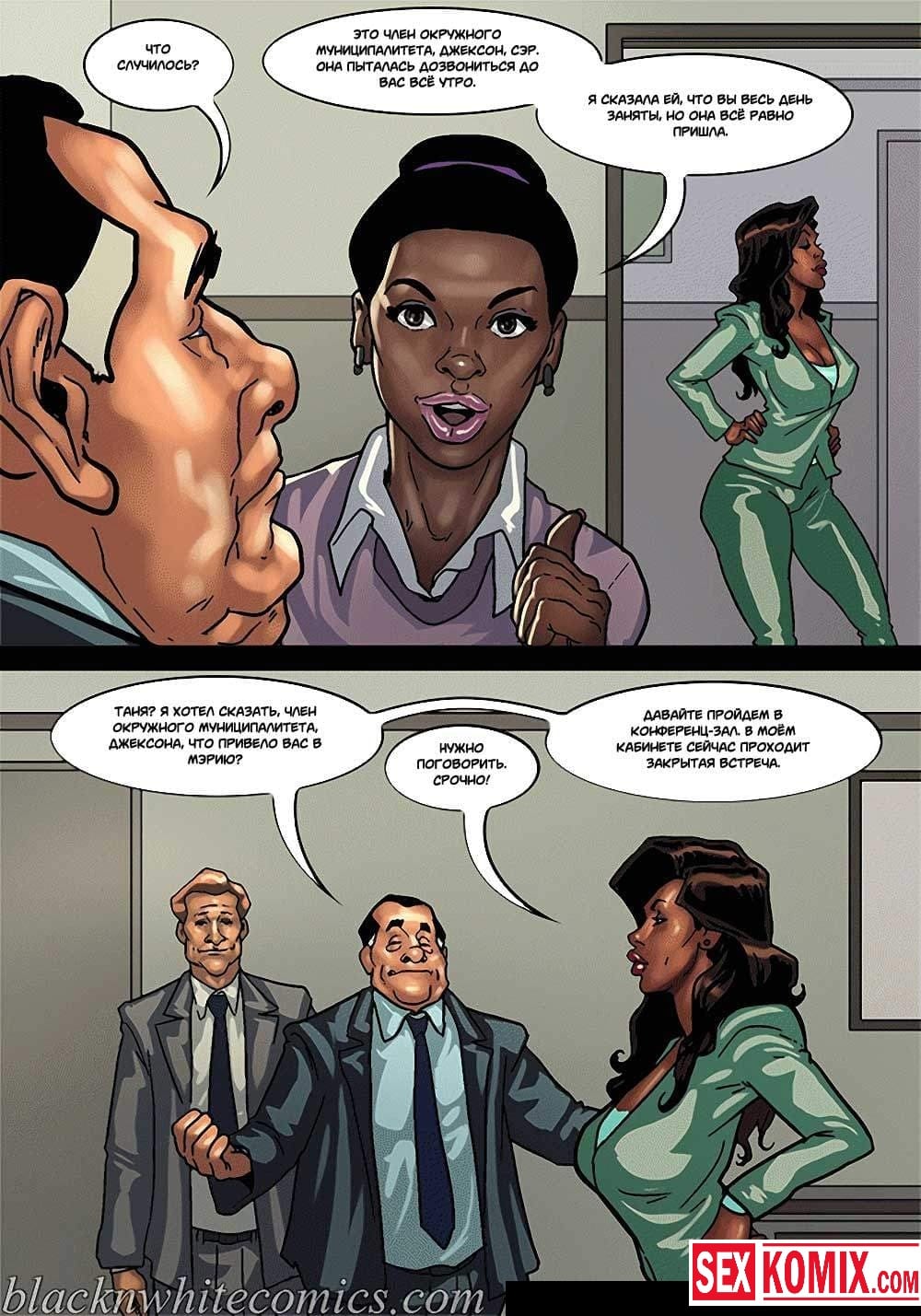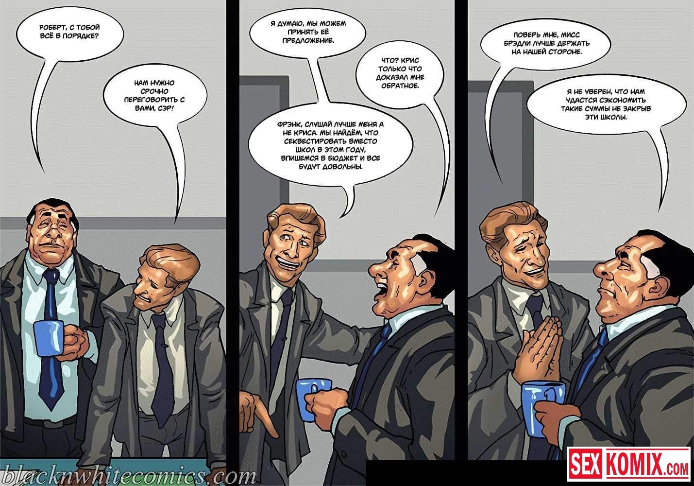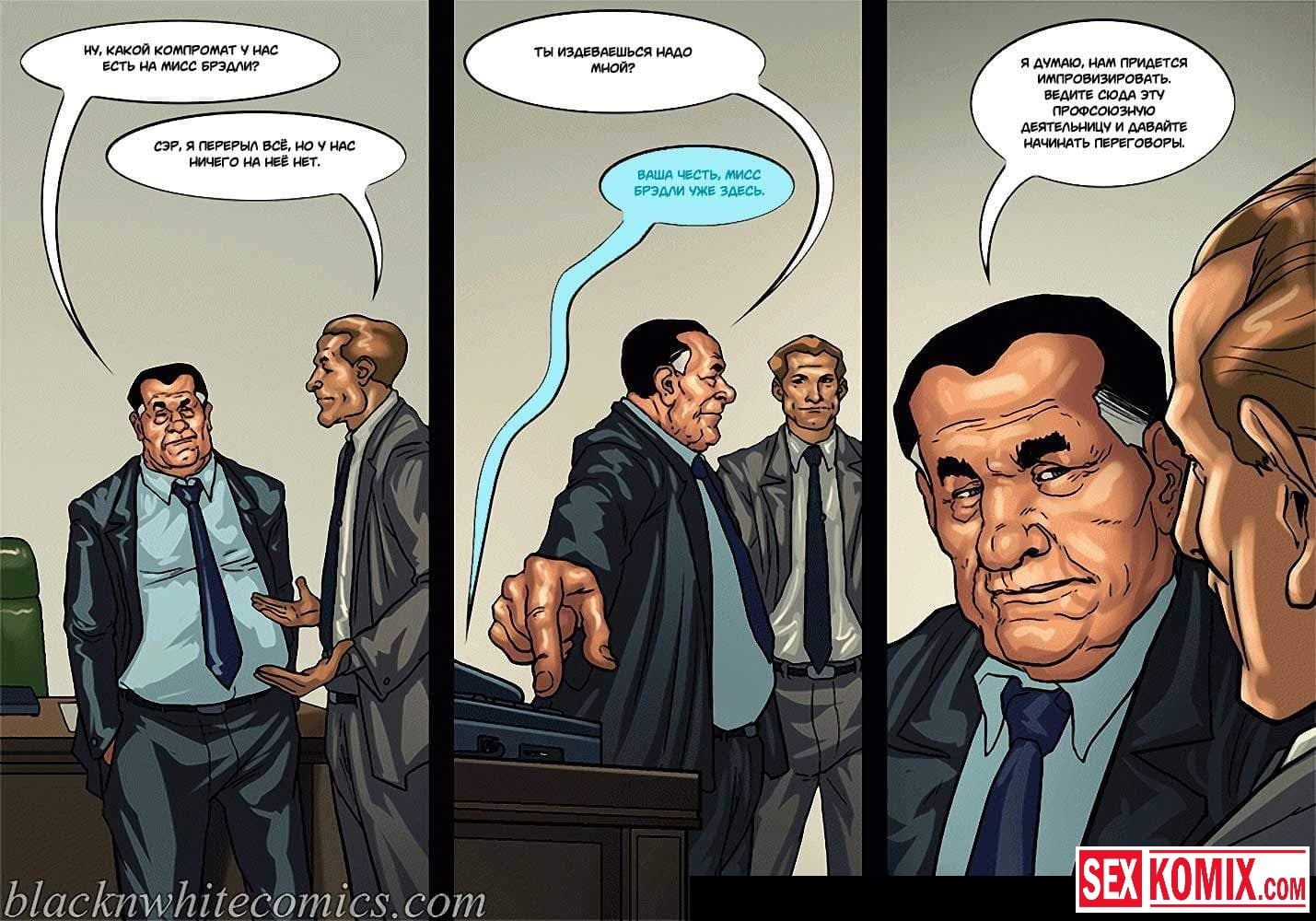 Порно комикс Мэр. Часть 3. Эпизод 2. Смелая женщина политик пытается надавить на мэра города своими связями. Она приезжает в его офис для переговоров, но коварный мужчина разрабатывает план, как убрать ее с дороги. Ему нужно найти компромат на эту женщину, его помощники сообщают, что такого нет. Тогда приходится импровизировать, вовремя их совещания мужчина соблазняет сексуальную женщину и занимается с ней сексом, пока его сотрудники снимают все на видеокамеру.