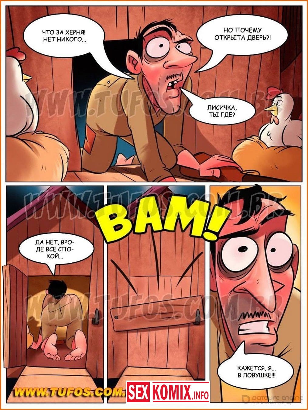 Порно комикс Деревенская семейка. Часть 8. Лиса в курятнике. В этой истории все начинается с того, что жена демонстрируя свою пышное тело пытается поднять член мужу, чтобы тот ее трухнул. Но муж сильно устал и не настроен на секс. Тут, ночью, ему показалось, что в курятник пробралась лиса, и он бежит проверить все ли там в порядке. Как только он заползает туда, то оказывается в ловушке, кто-то его запер снаружи. И в это время в спальню жены приходит чернокожий проказник с большим членом, и начинает ублажать сексуальную женщину.