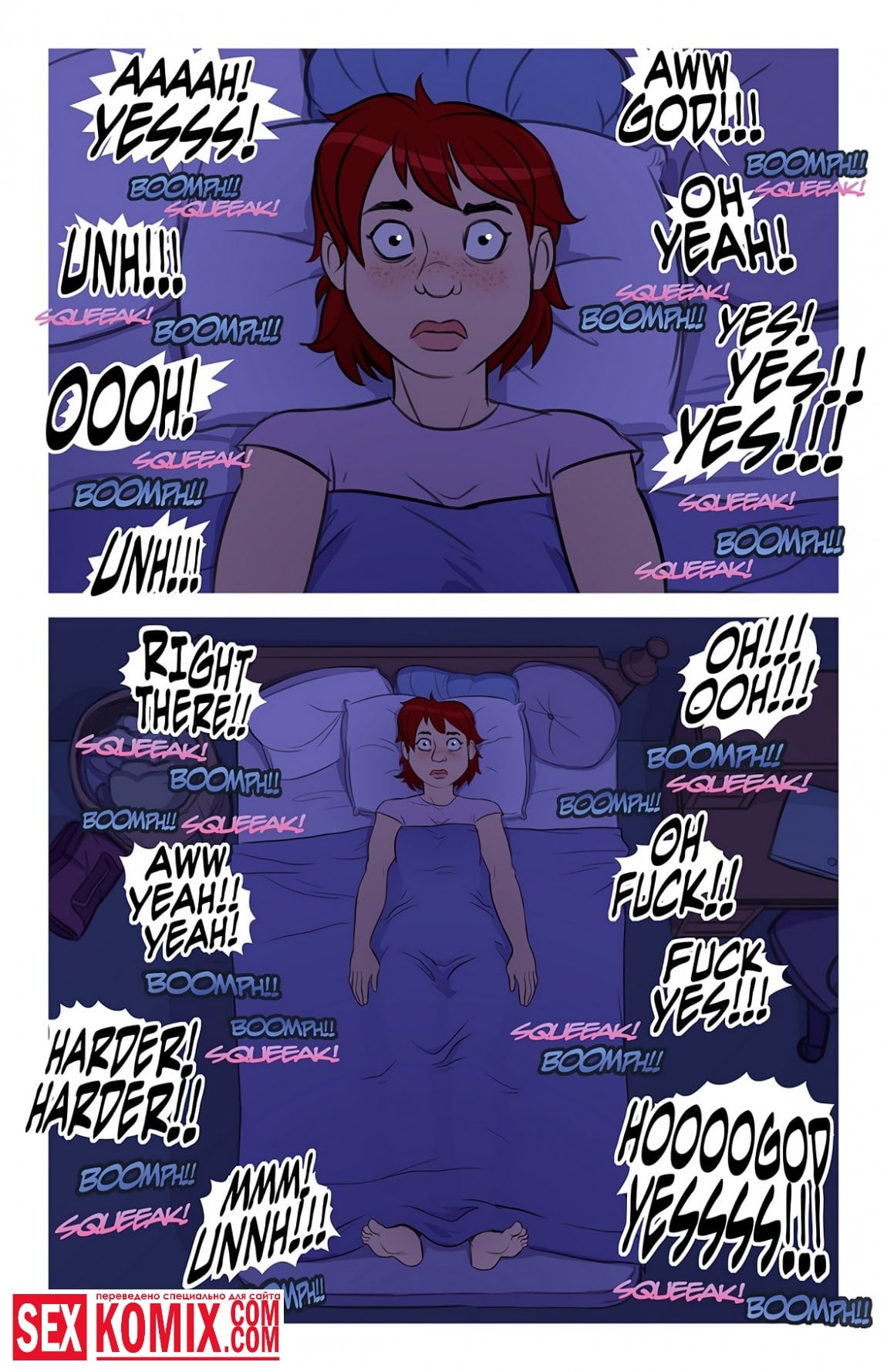 Порно комикс Всю ночь. Девушка снимает комнату рядом со своей подружкой, поздно ночью, когда она ложиться спать, через тонкие стены она слышит, как её подруга занимается сексом со своим парнем. Они активно трахаются, переговариваются развратными фразами, девушка возбуждается и начинает мастурбировать. В самом разгаре этого процесса в комнату врывается её подруга, со своим парнем абсолютно голые.