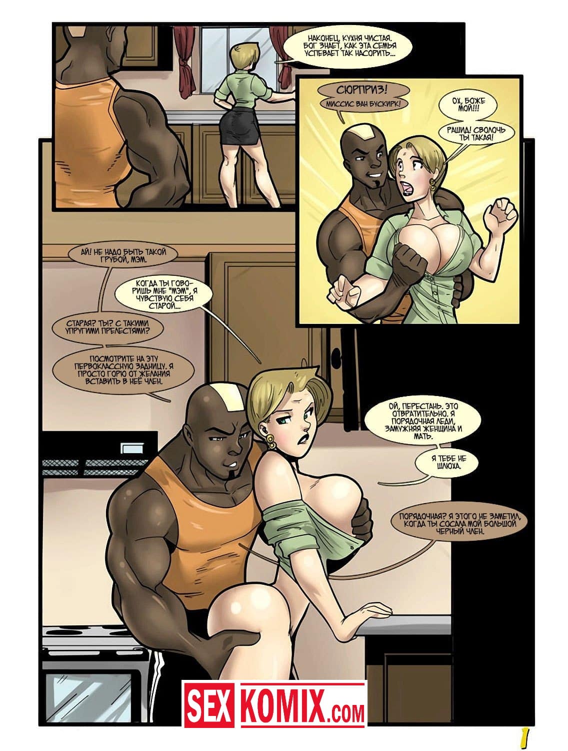 Порно комикс Обслуживание Ронды с чёрного хода. Жена вызвала домой чернокожего сантехника, пока муж поливал в саду цветы, он отремонтировал и трубы. Снизу увидел трусики сексуальной женщины, парню захотелось заняться с ней сексом. Он достал свой огромный чёрный член, когда женщина увидела его сразу потекла и захотел насадится. Они начали трахаться прямо на кухне, громкие стоны жены доносились на улицу. Муж заподозрил что-то неладное и решил сходить в том, чтобы проверить.