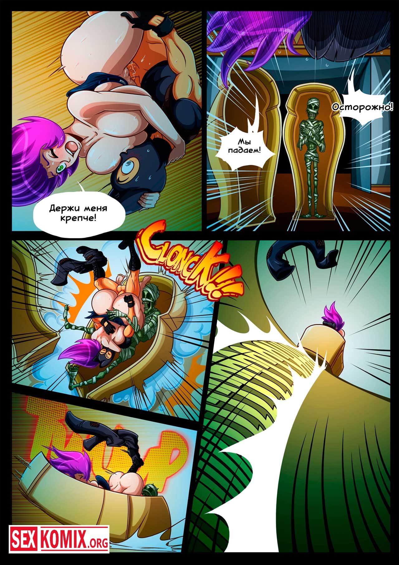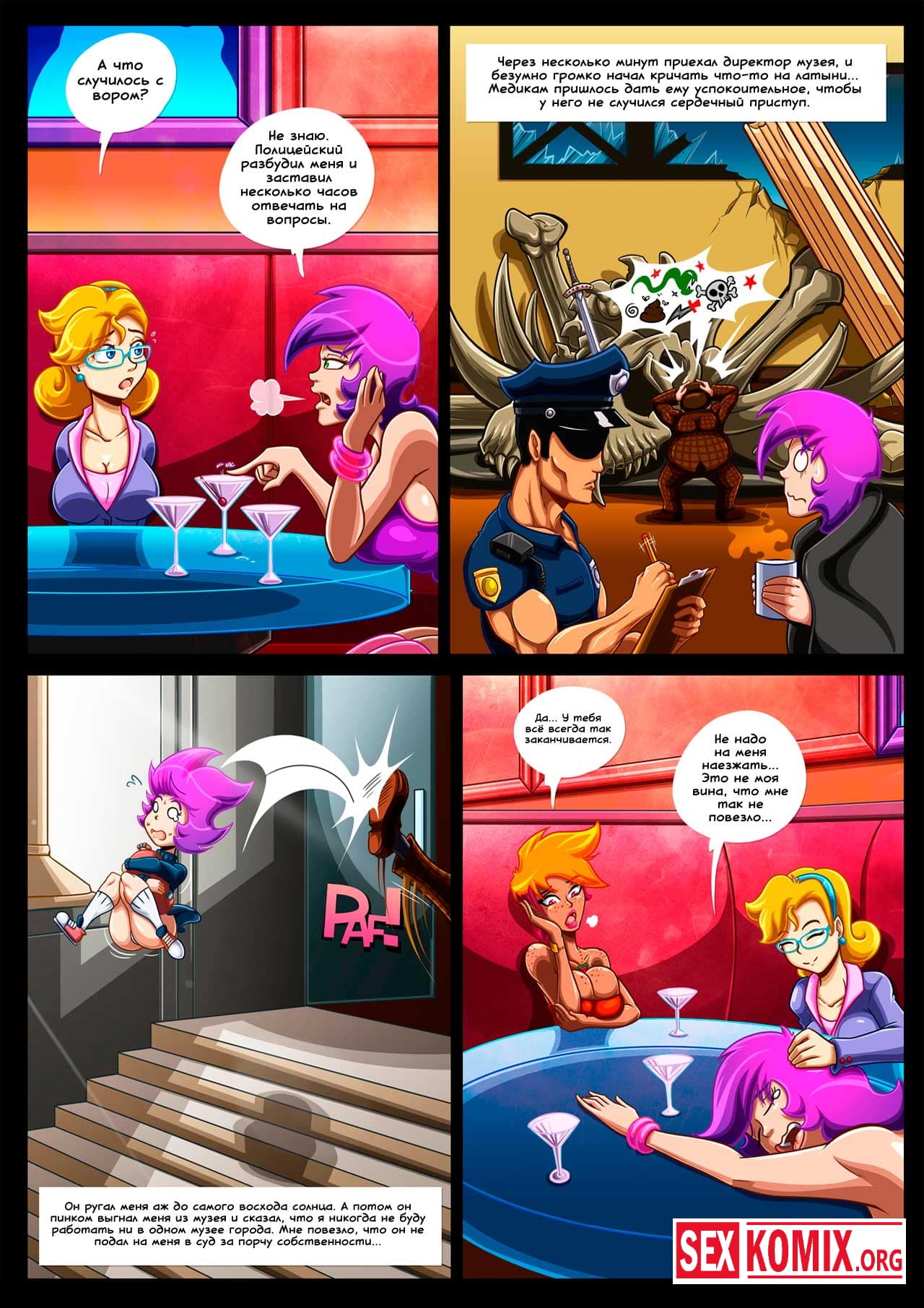Порно комикс Цепная реакция. Часть 2. Сексуальная девушка с большими сиськами работает ночным сторожем в музее. После того как она заступила на смены прошло несколько часов, и когда стемнело в музее стали происходить странные вещи. Какие звуки раздавались в темных коридорах, оказалось это грабитель проник в здание. Но когда он увидел красотку охранницу, захотел трахнуть её.
