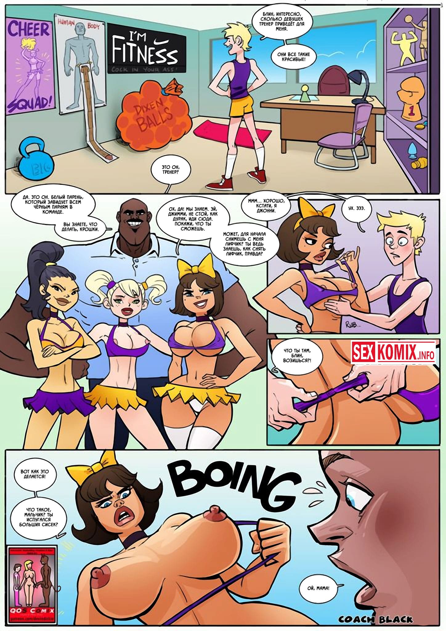 Порно комикс Чёрный тренер. Девушки из группы поддержки баскетбольной команды, пообещали горячий секс тем кто победит в этой игре. Победили чернокожие парни с большими членами, после игры они отправились в раздевалку за своим призом. Баскетболисты отлично трахнули чарлидерш, девушки на долго запомнят этот секс.