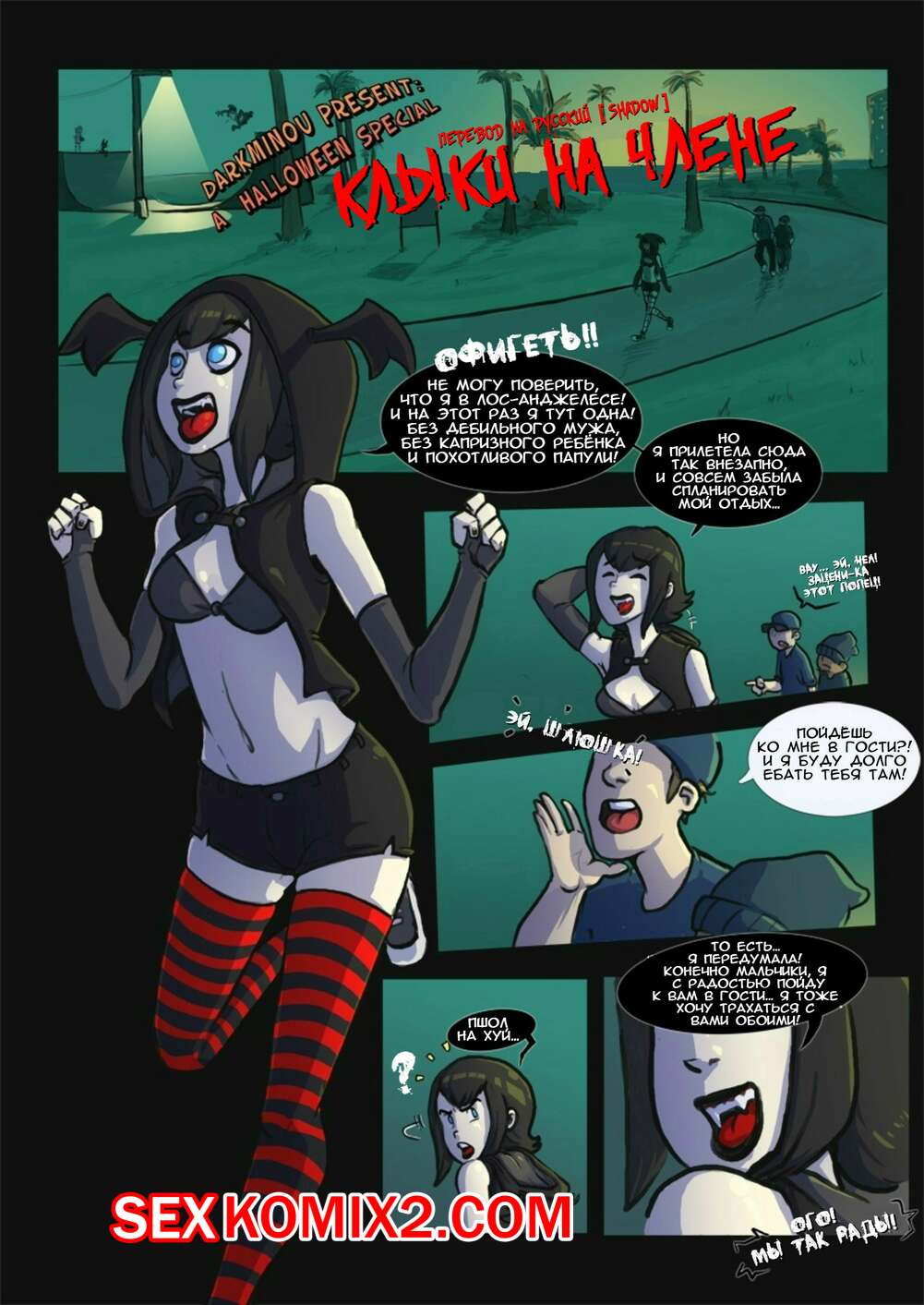 Порно комикс Монстры на каникулах. Клыки на члене Горячая сисястая красотка вампирша решила повеселиться со своими дружками. Она разделась перед ними и стала сосать их большие хуи, после чего дала им себя выебать.