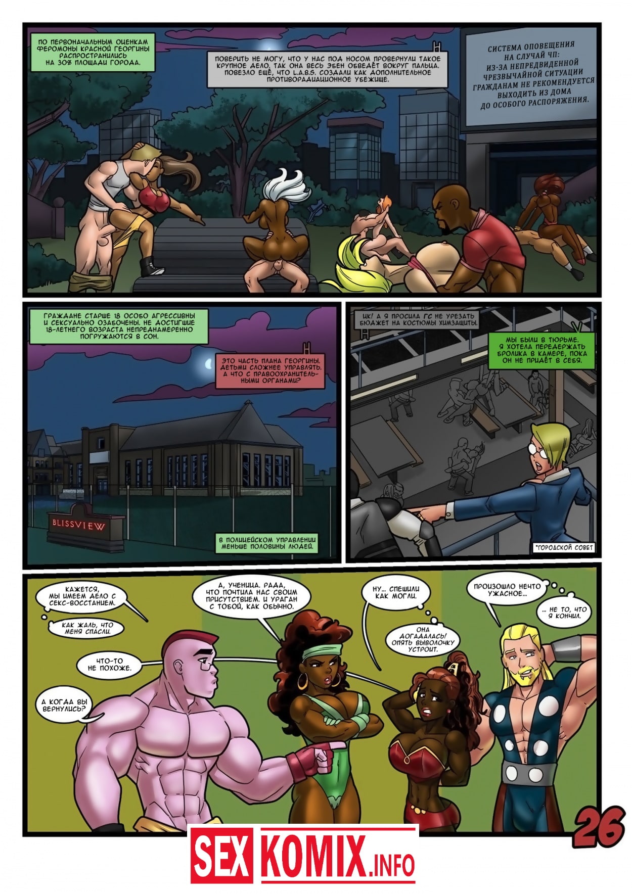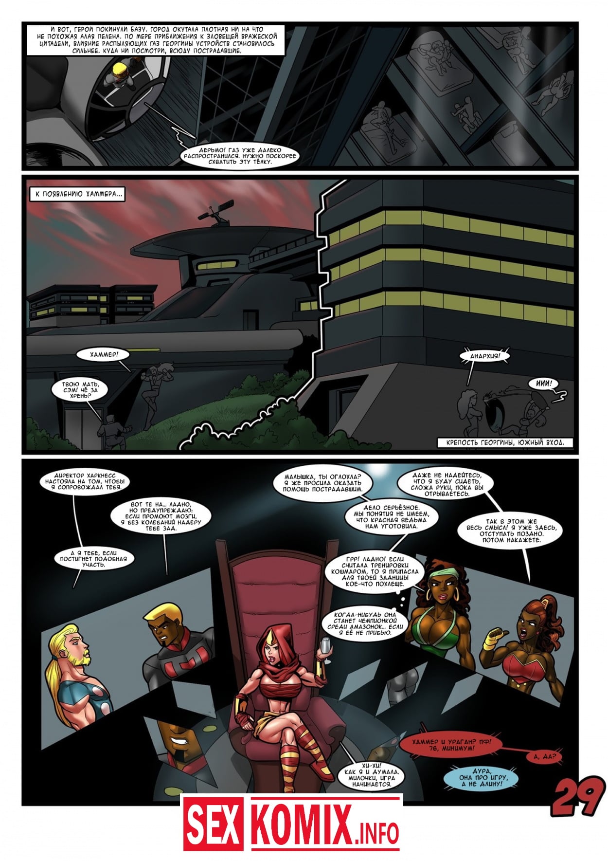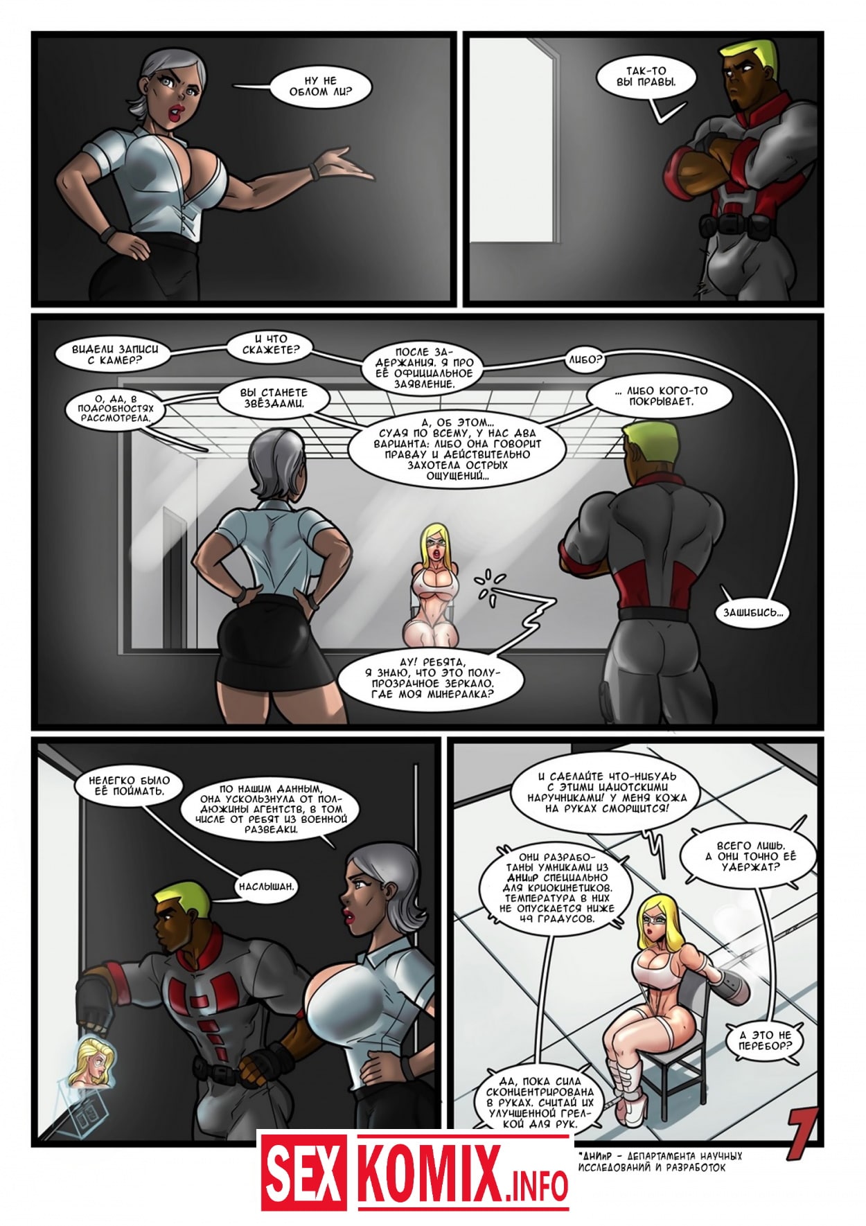 Порно комикс Геройские хроники. Поцелуй красной георгины. Два супер героя мужчина о женщина встретились на крыше небоскреба, ночь была тихая и значит можно расслабиться и заняться сексом. Девушка старается побить свой собственный рекорд, засунув огромный член своего напарника все глубже в свою глотку. После сочного отсоса их спортивные тела переплетаются и герои занимаются страстным сексом.